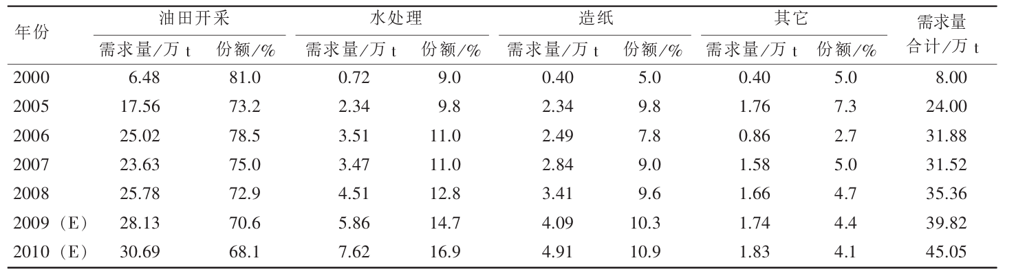 我國聚丙烯酷胺主要應用領域是石油開采水處理、造紙、高吸水性樹脂,冶金和洗煤等。我國聚丙烯酷胺消費結構及預測如表所示從表可以看出,在今后相當長的一段時間內國內聚丙烯酷胺產品的主要用戶是油田的三次采油和水處理行業。